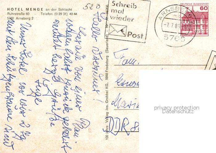 73844961 alte Postkarte Arnsberg Westfalen Hotel Menge postalisch gelaufen Erhaltung siehe scans [FriedD77] KatCode: 11110005958004