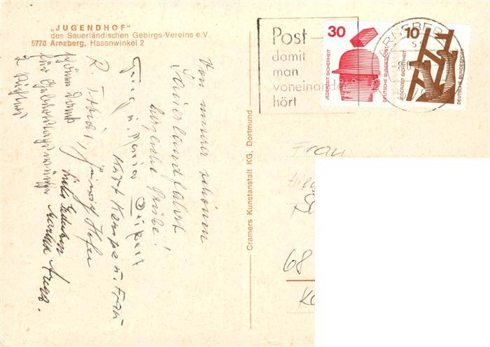 73942813 alte Postkarte Arnsberg Westfalen Jugendhof des SGV Arnsberg Saal Treppenaufgang postalisch gelaufen Erhaltung siehe scans [WerneD78] KatCode: 11110005958004