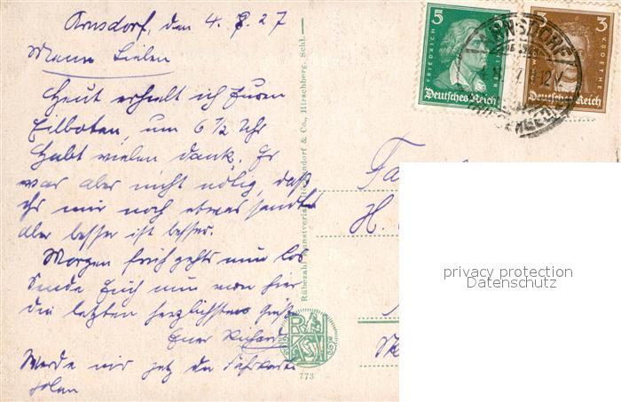 32980130 old postcard Arnsdorf Riesengebirge Ortsansicht postalisch gelaufen Erhaltung siehe scans [NatalD47] KatCode: 11520