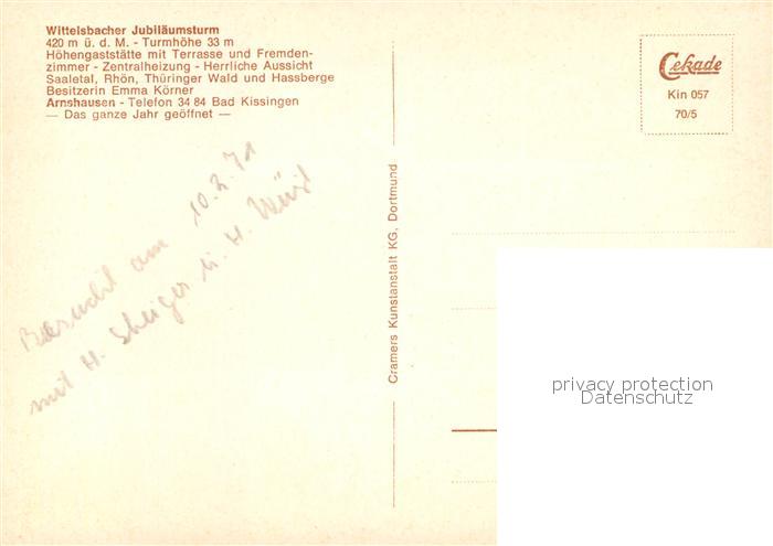 73030433 Arnshausen Wittelsbacher Jubilaeumsturm Hoehengaststaette mit Terrasse Saaletal Rhoen postalisch nicht gelaufen Erhaltung siehe scans [WerneD78] KatCode: 11110009672114