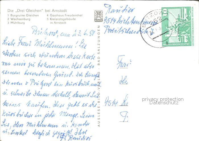 alte Postkarte Arnstadt Ilm Drei Gleichen Burgruine Wachsenburg Muehlburg postalisch gelaufen Erhaltung siehe scans
