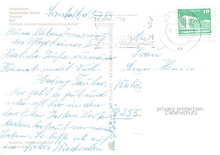 73012074 alte Postkarte Arnstadt Ilm Neideckturm Rudolstaedter Strasse Fischtor Bad HO Cafe DSF postalisch gelaufen Erhaltung siehe scans [WerneD78] KatCode: 11110016070004