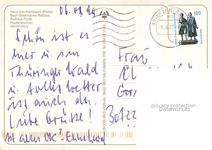 72838564 alte Postkarte Arnstadt Ilm Portal Haus zum Palmbaum Bach Denkmal Rathaus Hopfenbrunnen Marlitthaus Wappen postalisch gelaufen Erhaltung siehe scans [FriedD77] KatCode: 11110016070004