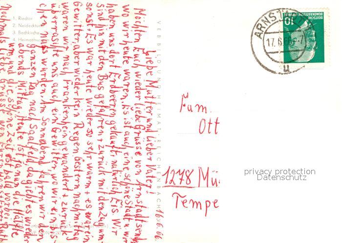 73007153 alte Postkarte Arnstadt Ilm Riedtor Neideckturm Bachkirche Heimatmuseum postalisch gelaufen Erhaltung siehe scans [WerneD78] KatCode: 11110016070004