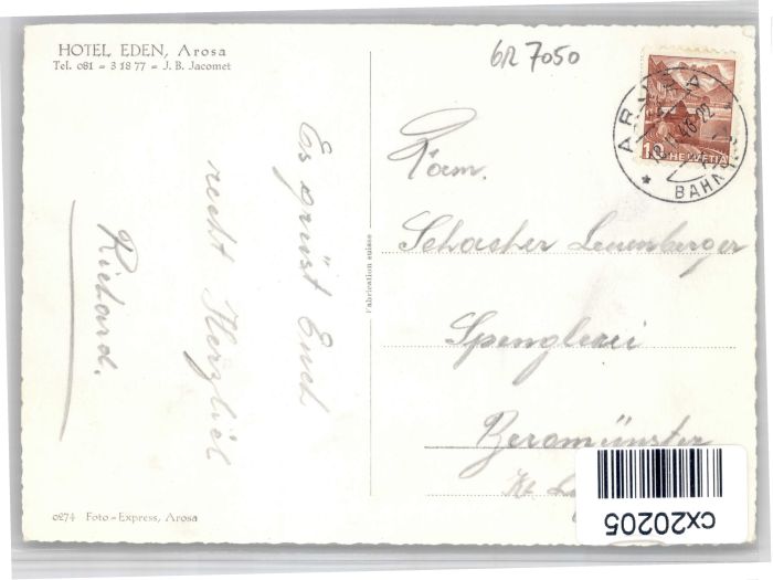 10738045 alte Postkarte Arosa GR Arosa Hotel Eden postalisch gelaufen KatCode: 11470100345296