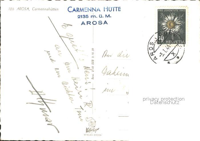 11637659 alte Postkarte Arosa GR Carmennahuetten postalisch gelaufen Erhaltung siehe scans KatCode: 11470100345296