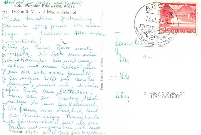 12838931 alte Postkarte Arosa GR Hotel Pension Edelweiss Winter postalisch gelaufen Erhaltung siehe scans [KathaD81] KatCode: 11470100345296