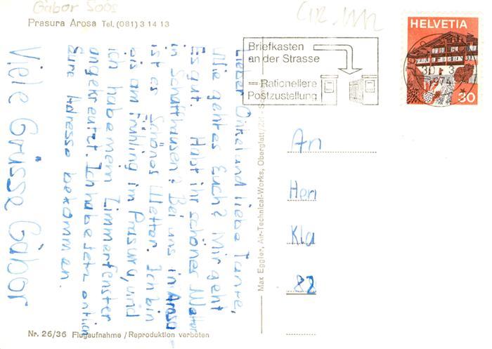 13925905 alte Postkarte Arosa GR Hotel Prasura postalisch gelaufen Erhaltung siehe scans [WerneD78] KatCode: 11470100345296