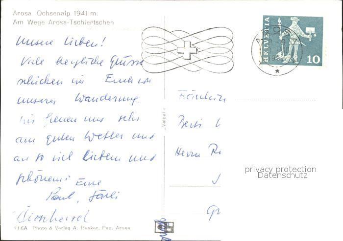 11645581 alte Postkarte Arosa GR Ochsenalp Arosa-Tschiertschen postalisch gelaufen Erhaltung siehe scans KatCode: 11470100345296