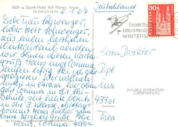 12983671 alte Postkarte Arosa GR Sporthotel Hof Maran postalisch gelaufen Erhaltung siehe scans [NatalD47] KatCode: 11470100345296