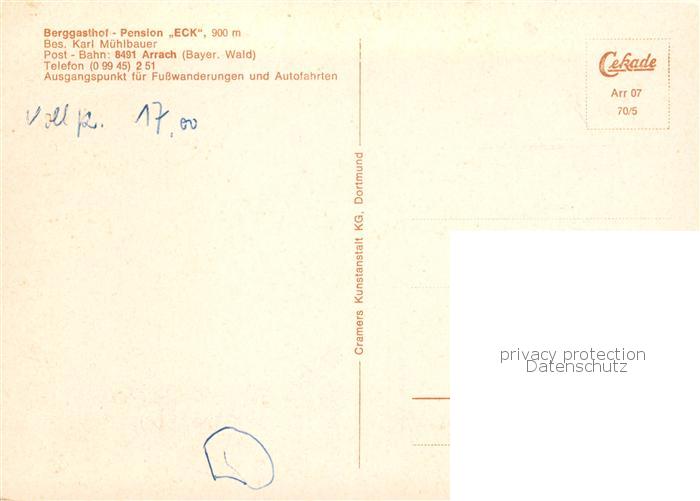 73840658 Arrach Berggasthof Pension Eck Waldschmidt-Denkmal Riedelstein Rauchroehren Felsformationen Muehlriegel Gipfelkreuz Bayerischer Wald postalisch nicht gelaufen Erhaltung siehe scans [FriedD77] KatCode: 11110009372113
