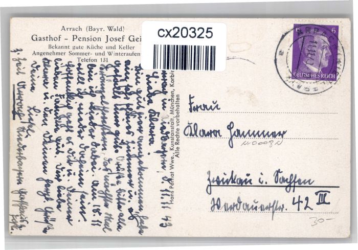 30739724 alte Postkarte Arrach Gasthof Pension Josef Geiger Gasthaus zur Post postalisch gelaufen KatCode: 11110009372113