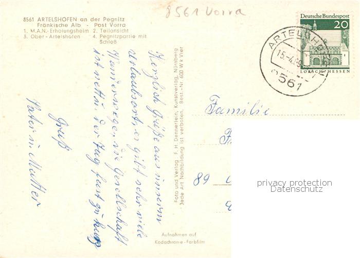73830526 alte Postkarte Artelshofen Vorra MAN Erholungsheim Panorama Ober Artelshofen Pegnitzpartie mit Schloss postalisch gelaufen Erhaltung siehe scans [WerneD78] KatCode: 11110009574161
