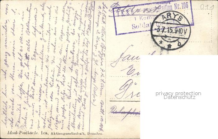 32341856 old postcard Arys Ostpreussen Soldatenunterkunft Gruppenfoto postalisch gelaufen Feldpost Erhaltung siehe scans KatCode: 11410