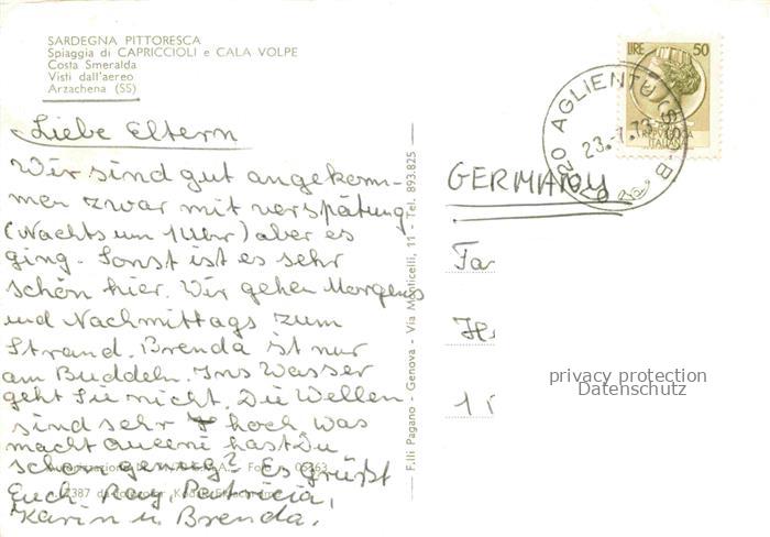 74040403 old postcard Arzachena Costa Smeralda Sardegna IT Spiaggia di Capriccioli e Cala Volpe vista aereo postalisch gelaufen Fliegeraufnahme Erhaltung siehe scans [FriedD77] KatCode: 11240
