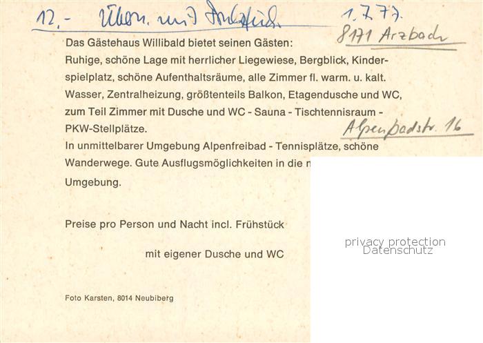 73651499 Arzbach Bad Toelz Gaestehaus Willibald Gastraum Swimming Pool Winterpanorama Alpenblick postalisch nicht gelaufen Werbekarte (keine Postkarte) Erhaltung siehe scans [FriedD77] KatCode: 11110009173145