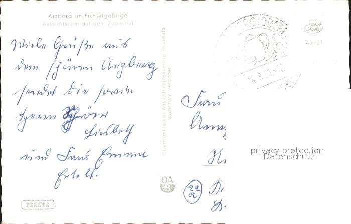 72201022 alte Postkarte Arzberg Oberfranken Aussichtsturm auf dem Zuckerhut postalisch gelaufen Erhaltung siehe scans KatCode: 11110009479112