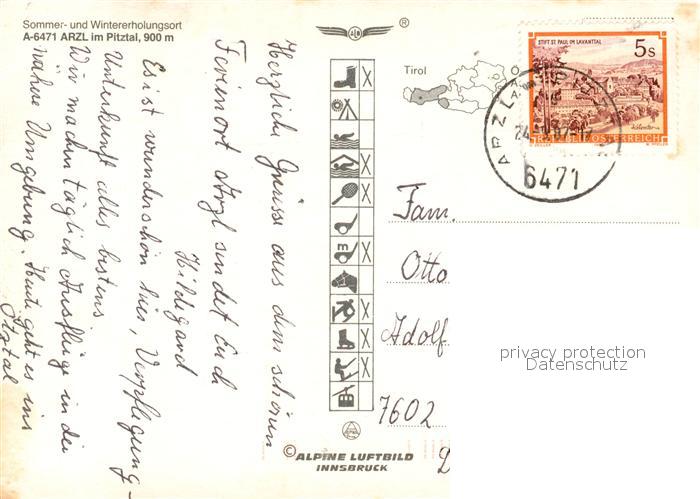 73340284 alte Postkarte Arzl Pitztal Gesamtansicht mit Alpenpanorama Fliegeraufnahme postalisch gelaufen Erhaltung siehe scans [FriedD77] KatCode: 11390334070201