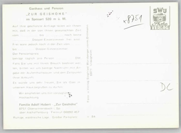 40245858 Aschaffenburg Main Aschaffenburg Oberwintersbach Gasthaus Pension Zur Geishoehe Postalisch nicht gelaufen Alte Ansichtskarte Postkarte Katcode 11110009661000