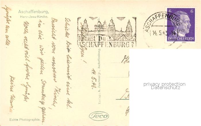 73803149 alte Postkarte Aschaffenburg Main Herz Jesu Kirche postalisch gelaufen Erhaltung siehe scans [FriedD77] KatCode: 11110009661000