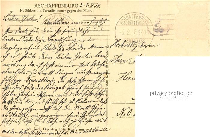 73773341 alte Postkarte Aschaffenburg Main Schloss Terrassenmauer gegen den Main Kuenstlerkarte postalisch gelaufen Erhaltung siehe scans [FriedD77] KatCode: 11110009661000