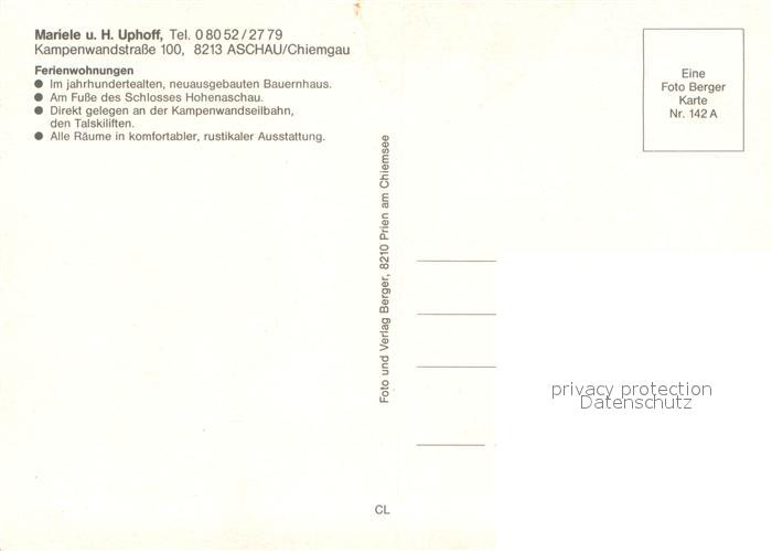 73653012 Aschau Chiemgau Ferienwohnungen Mariele Uphoff postalisch nicht gelaufen Erhaltung siehe scans [WerneD78] KatCode: 11110009187114