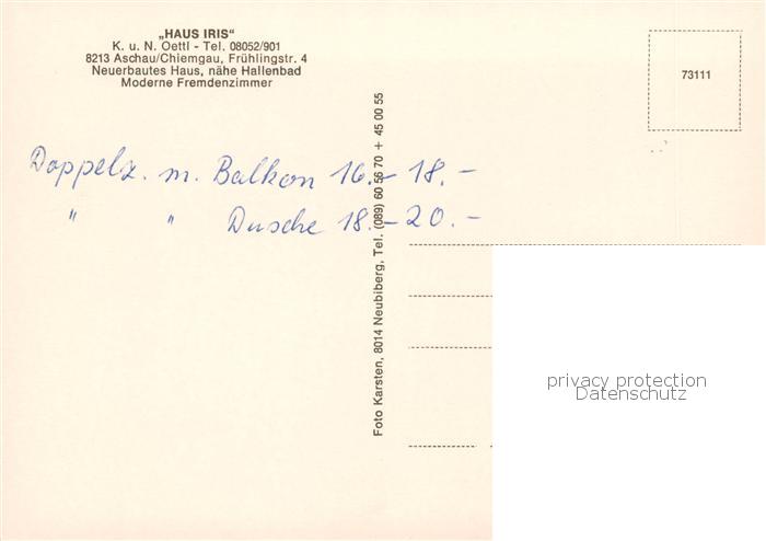 73788043 Aschau Chiemgau Haus Iris Gaestehaus Pension postalisch nicht gelaufen Erhaltung siehe scans [FriedD77] KatCode: 11110009187114
