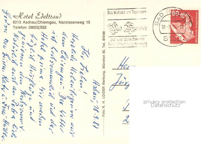 73654512 alte Postkarte Aschau Chiemgau Hotel Edeltraut Restaurant Ortsansicht mit Alpenpanorama postalisch gelaufen Erhaltung siehe scans [FriedD77] KatCode: 11110009187114