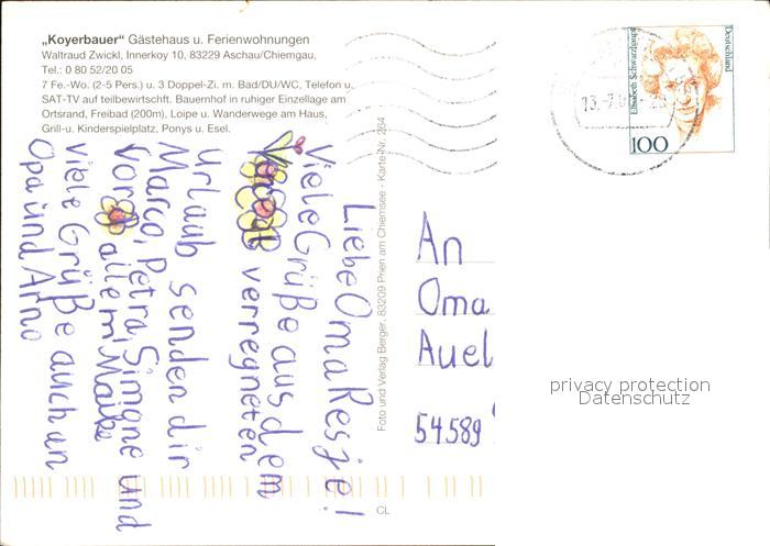 72492304 alte Postkarte Aschau Chiemgau Koyerbauer Gaestehaus Brunnen Seilbahn postalisch gelaufen Erhaltung siehe scans KatCode: 11110009187114