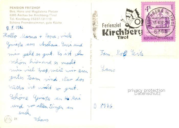 13189423 alte Postkarte Aschau Tirol Pension Fritzhof postalisch gelaufen Erhaltung siehe scans [PaolaD17] KatCode: 11390335070902