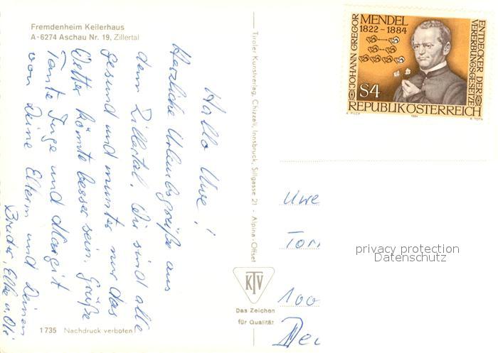 13326967 alte Postkarte Aschau Zillertal Fremdenheim Keilerhaus postalisch gelaufen Erhaltung siehe scans [KathaD81] KatCode: 11390335070902