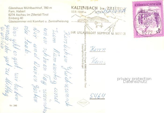 13232245 alte Postkarte Aschau Zillertal Gaestehaus Muehlbachhof postalisch gelaufen Erhaltung siehe scans [NatalD47] KatCode: 11390335070902