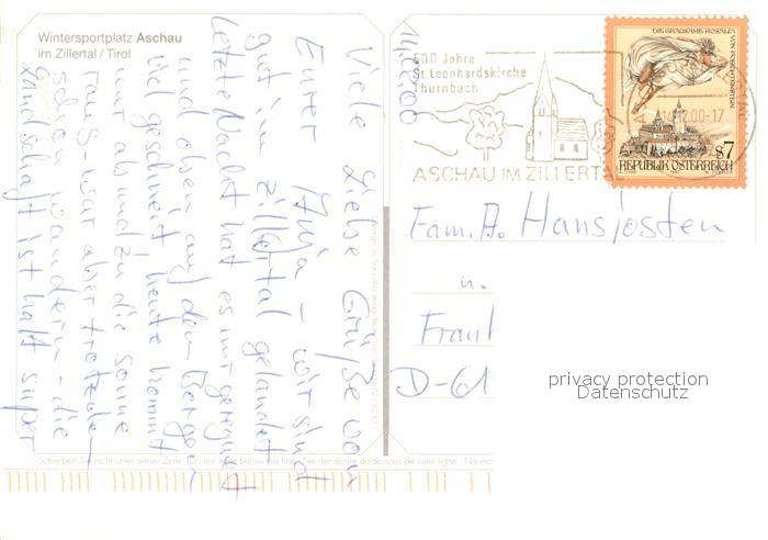 73591903 alte Postkarte Aschau Zillertal Ortsansicht mit Kirche Wintersportplatz im Zillertal Alpen postalisch gelaufen Erhaltung siehe scans [FriedD77] KatCode: 11390335070902