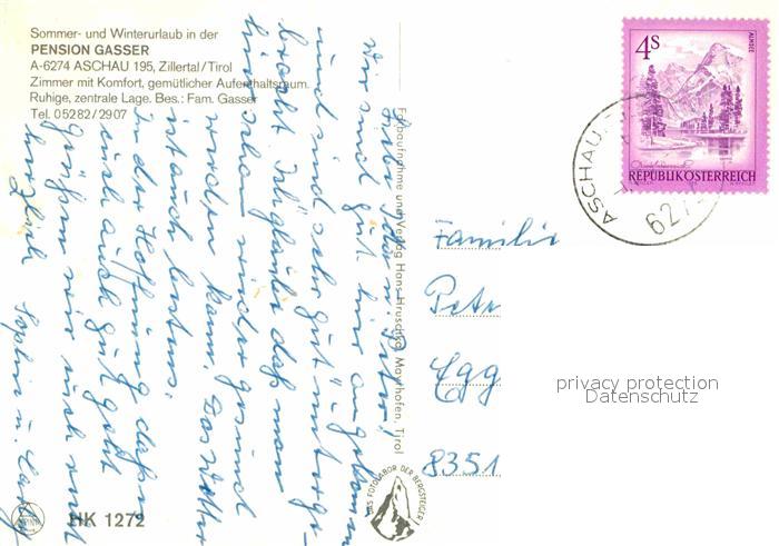 12602869 alte Postkarte Aschau Zillertal Pension Gasser postalisch gelaufen Erhaltung siehe scans [LiesaD40] KatCode: 11390335070902