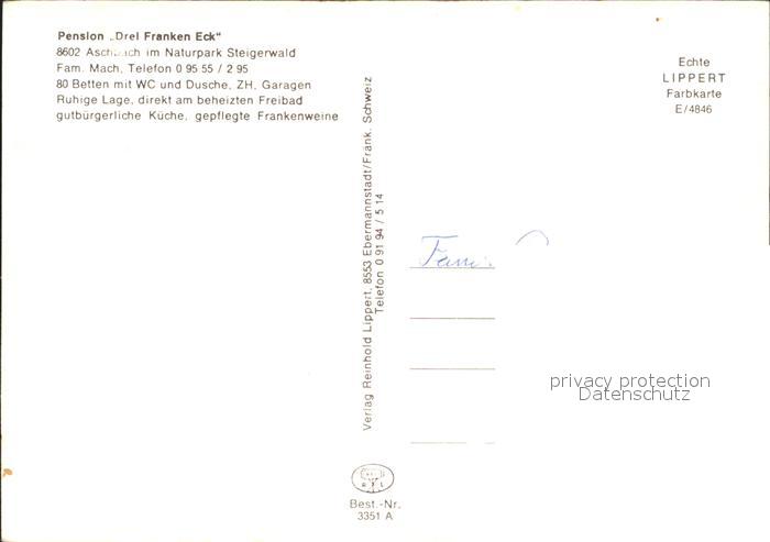 71932132 Aschbach Oberfranken Pension Drei Fanken Eck Fassadenmalerei Naturpark Steigerwald postalisch nicht gelaufen Erhaltung siehe scans KatCode: 11110009471220
