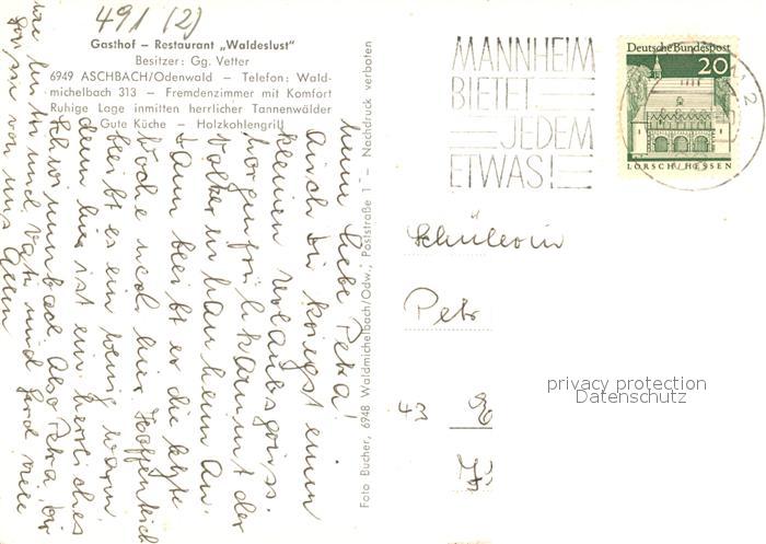 73324248 alte Postkarte Aschbach Odenwald Gasthof Restaurant Waldeslust postalisch gelaufen Erhaltung siehe scans [FriedD77] KatCode: 11110006431021