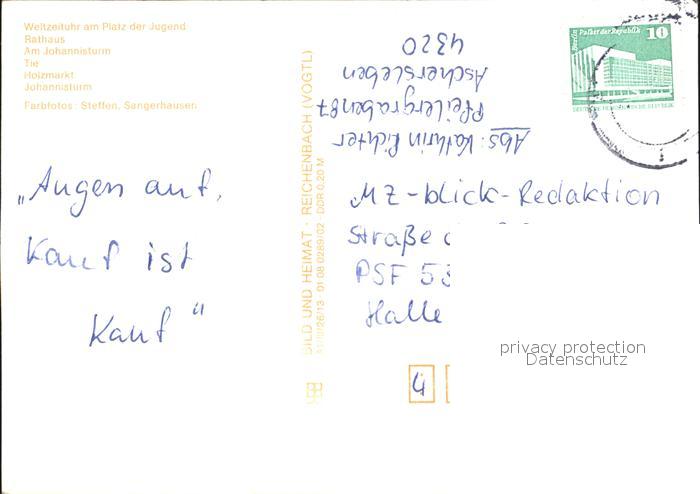 72016573 alte Postkarte Aschersleben Sachsen-Anhalt Weltzeituhr Platz der Jugend Rathaus postalisch gelaufen KatCode: 11110015089015