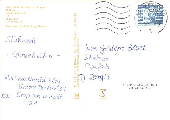 72461702 alte Postkarte Aschersleben Sachsen-Anhalt Weltzeituhr Rathaus Johannisturm Tie Holzmarkt postalisch gelaufen Erhaltung siehe scans KatCode: 11110015089015