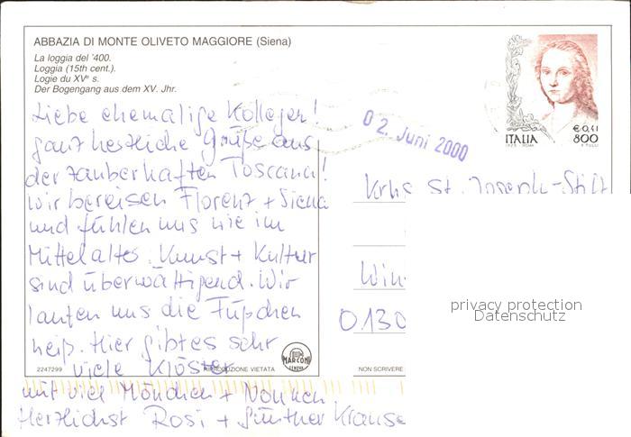 old postcard Asciano Abbazia di Monte Oliveto Maggiore La loggia Kloster Bogengang postalisch gelaufen Erhaltung siehe scans