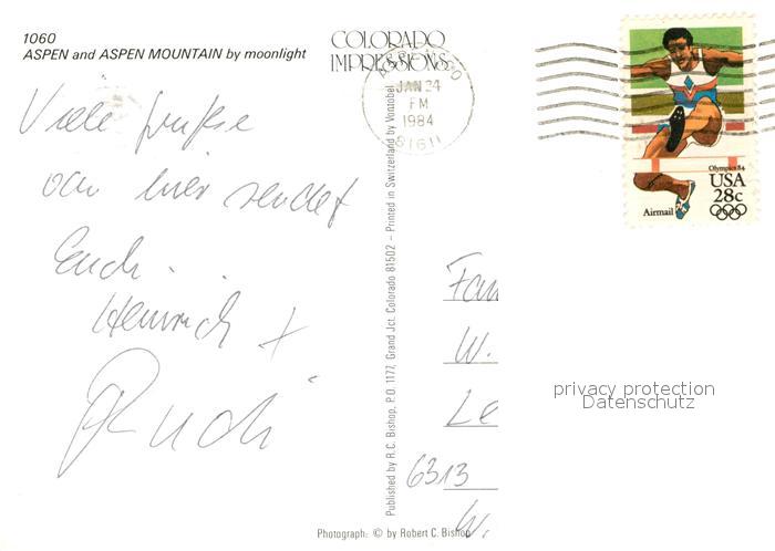 73361296 old postcard Aspen and Aspen Mountain by moonlight postalisch gelaufen Erhaltung siehe scans [FriedD77] KatCode: 14140060000000