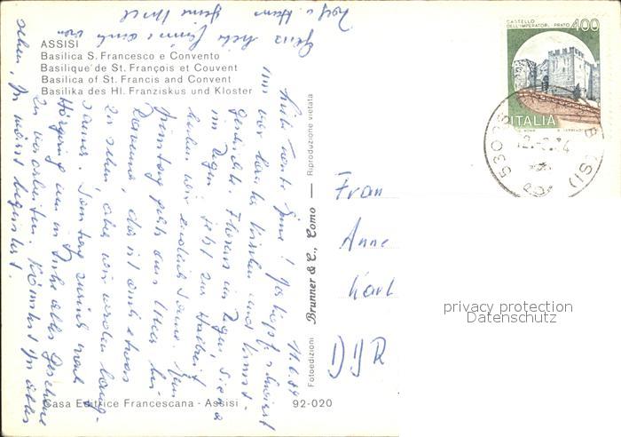 old postcard Assisi Umbria Basilica San Francesco e Convento Basilika Kloster postalisch gelaufen Erhaltung siehe scans