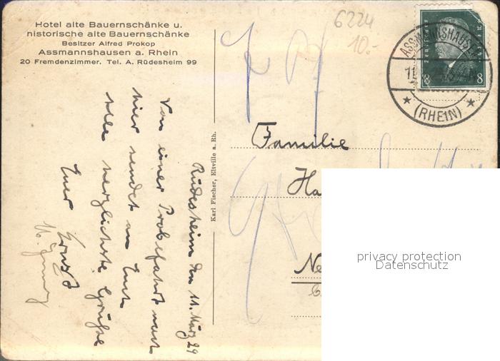 72096438 alte Postkarte Assmannshausen Hotel alte Bauernschaenke postalisch gelaufen Erhaltung siehe scans KatCode: 11110006439013