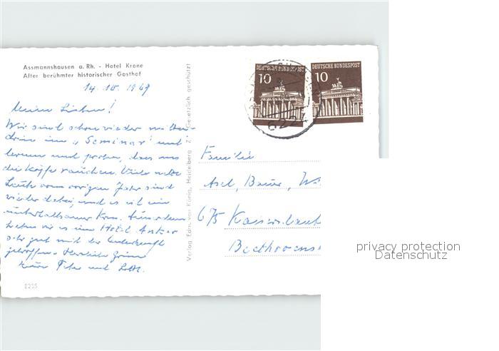72109379 alte Postkarte Assmannshausen Hotel Krone postalisch gelaufen Erhaltung siehe scans KatCode: 11110006439013