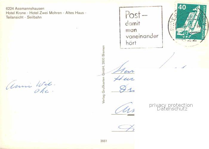 72906026 alte Postkarte Assmannshausen Hotel Krone Hotel Zwei Mohren Altes Haus Teilansicht Seilbahn postalisch gelaufen Erhaltung siehe scans [AndreD76] KatCode: 11110006439013