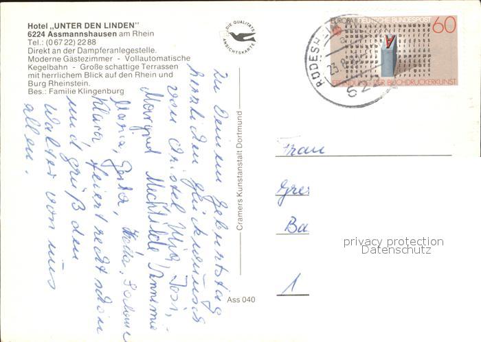 alte Postkarte Assmannshausen Hotel Unter den Linden postalisch gelaufen Erhaltung siehe scans
