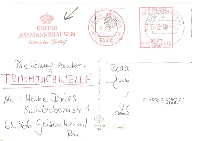 72940650 alte Postkarte Assmannshausen Krone Historischer Gasthof Uferpartie am Rhein postalisch gelaufen Erhaltung siehe scans [FriedD77] KatCode: 11110006439013