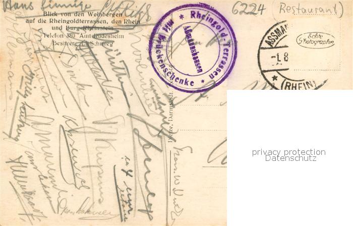 73696529 alte Postkarte Assmannshausen Nationaldenkmal Niederwald Burg Rheinstein Loreley Rheingoldterrassen Burg Pfalz Caub postalisch gelaufen Erhaltung siehe scans [FriedD77] KatCode: 11110006439013