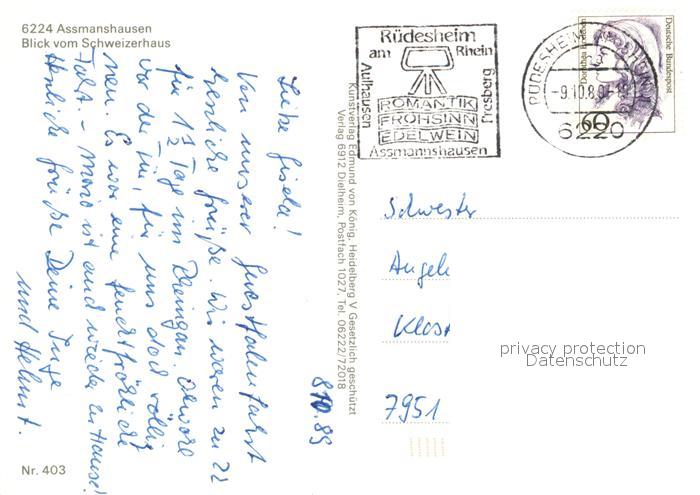 73168692 alte Postkarte Assmannshausen Panorama vom Schweizerhaus Schiffe Aneger postalisch gelaufen Erhaltung siehe scans [KathaD81] KatCode: 11110006439013