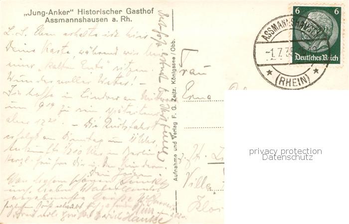 73818729 alte Postkarte Assmannshausen Rhein Historischer Gasthof Jung Anker postalisch gelaufen Erhaltung siehe scans [FriedD77] KatCode: 11110006439013