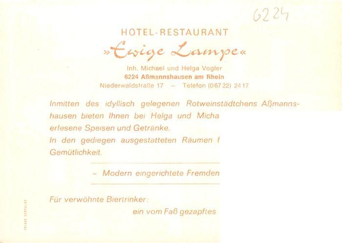 73935923 Assmannshausen Rhein Hotel Restaurant Ewige Lampe Gastraeume Bar postalisch nicht gelaufen Werbekarte (keine Postkarte) Erhaltung siehe scans [FriedD77] KatCode: 11110006439013